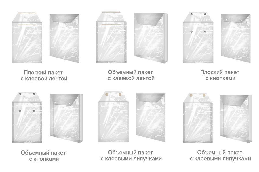 Пакеты и мешки из ПВХ и ПЭ пленок могут отличаться конструкцией клапанов (клеевой, на кнопках, ZIP-замок). Данные пакеты применяются для упаковки текстильных изделий и товаров, приобретённых на электронных площадках.